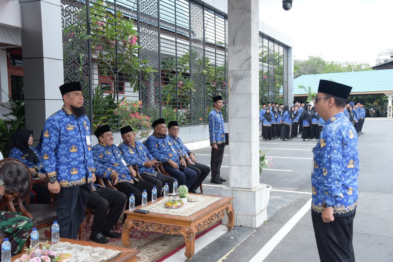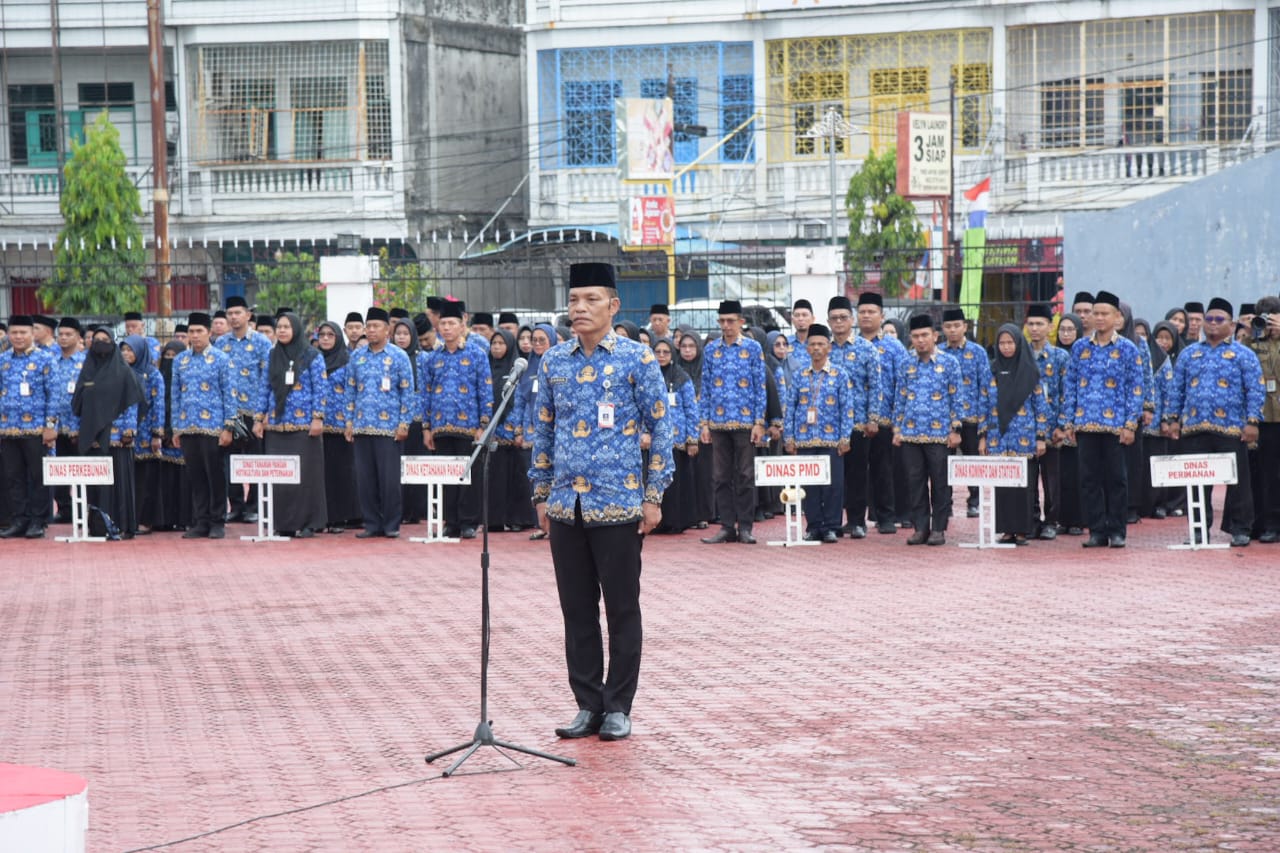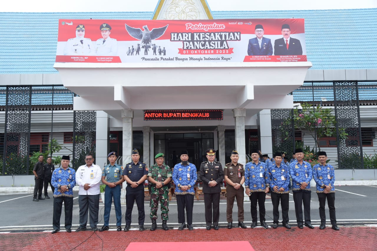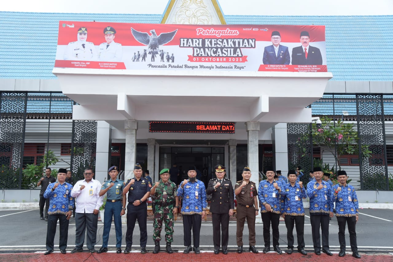 BENGKALIS - Bupati Bengkalis Kasmarni diwakili Asisten Pemerintahan dan Kesejahteraan Rakyat Andris Wasono menjadi inspektur upacara pada apel Peringatan Hari Kesaktian Pancasila, Rabu, 1 Oktober 2025 di halaman Kantor Bupati Bengkalis.