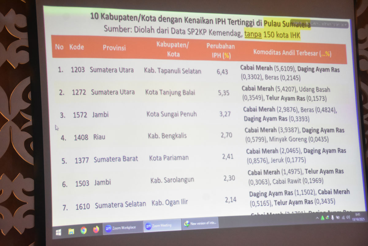 BENGKALIS – Kabupaten Bengkalis menjadi sorotan dalam rapat koordinasi pengendalian inflasi nasional setelah tercatat masuk dalam 10 besar kabupaten/kota dengan kenaikan Indeks Perkembangan Harga (IPH) tertinggi di Pulau Sumatera. Tak tanggung-tanggung, Negeri Junjungan menempati posisi keempat dengan lonjakan IPH mencapai 2,70 persen pada minggu kedua Oktober 2025.