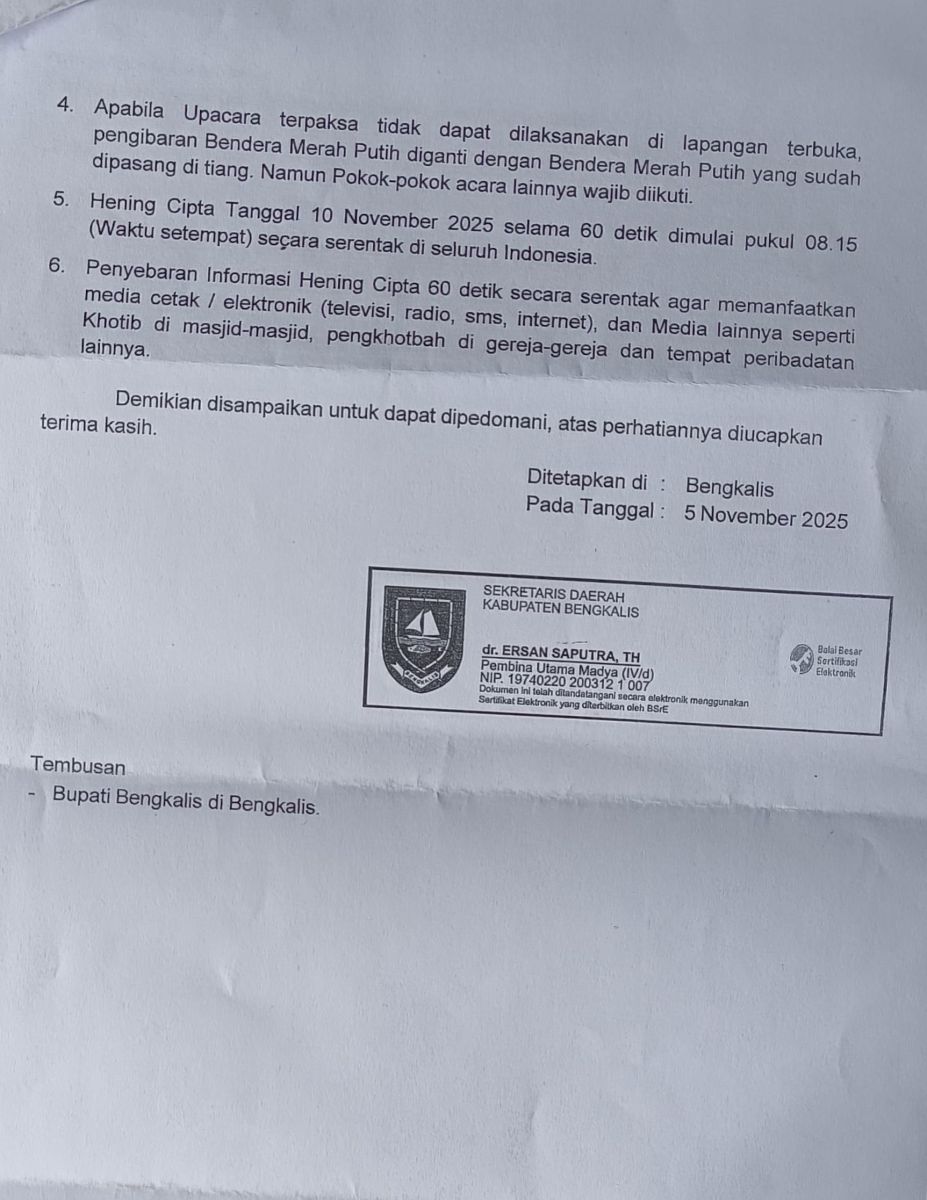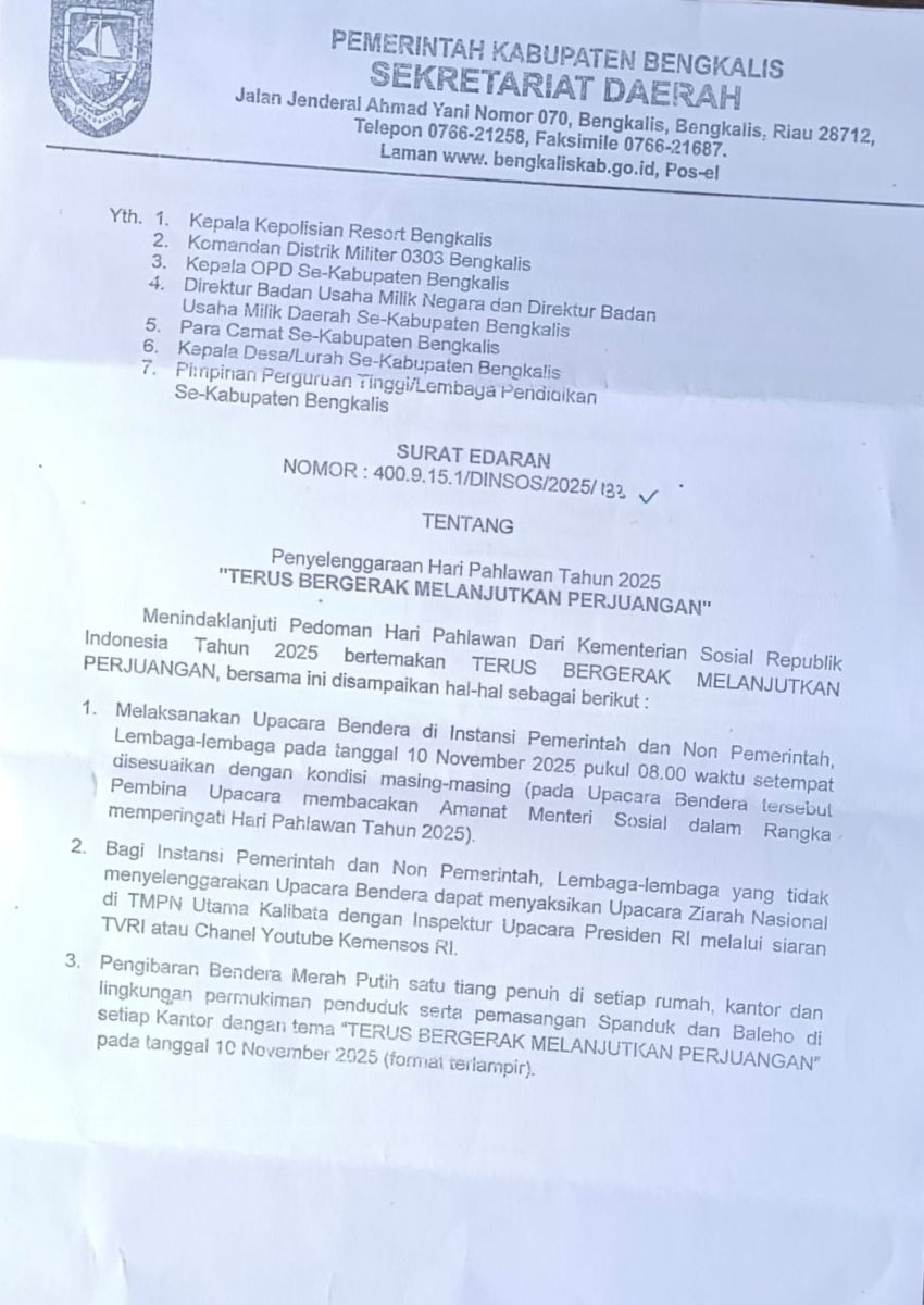 BENGKALIS - Dalam rangka memperingati Hari Pahlawan yang akan digelar 10 November 2025, Pemkab Bengkalis mengajak masyarakat untuk mengheningkan cipta selama 60 detik secara serentak pada pukul 08.15 WIB.