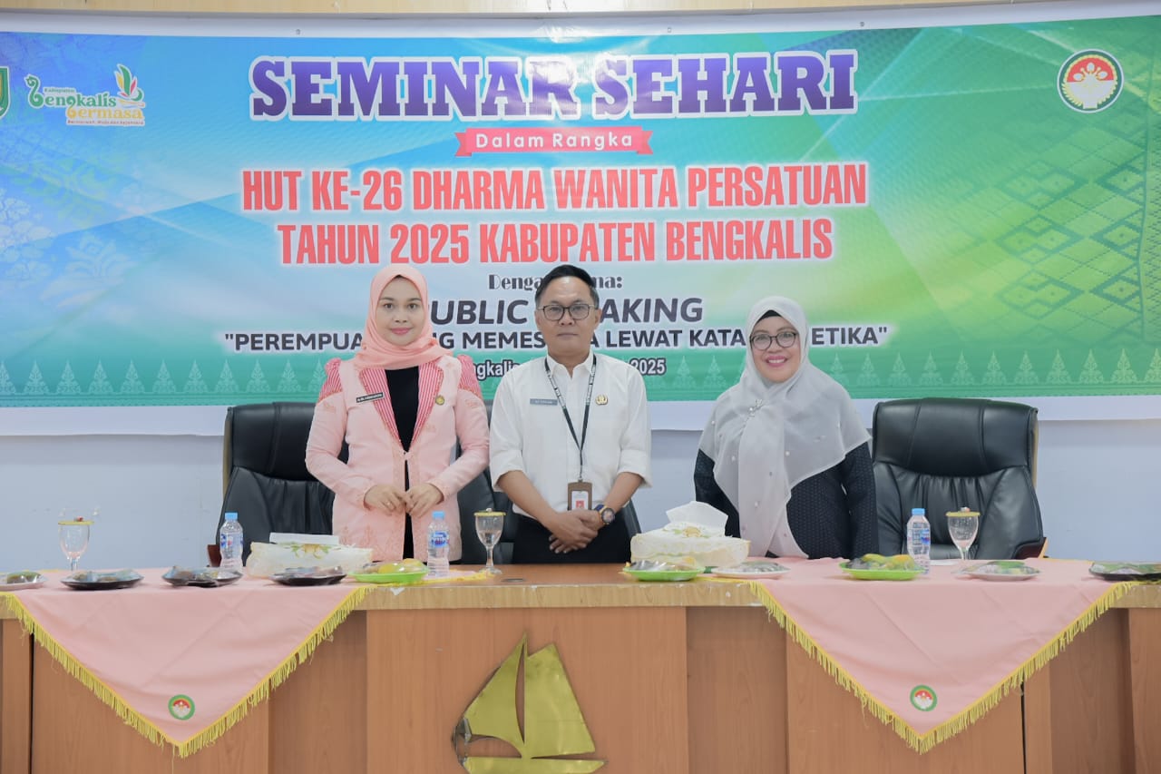 BENGKALIS - Sekretaris Daerah Kabupaten Bengkalis, dr. Ersan Saputra membuka seminar sehari dalam rangka memperingati Hari Ulang Tahun (HUT) ke-26 Darma Wanita Persatuan (DWP) Kabupaten Bengkalis Tahun 2025, Rabu, 12 November 2025 di Gedung Daerah Bengkalis.