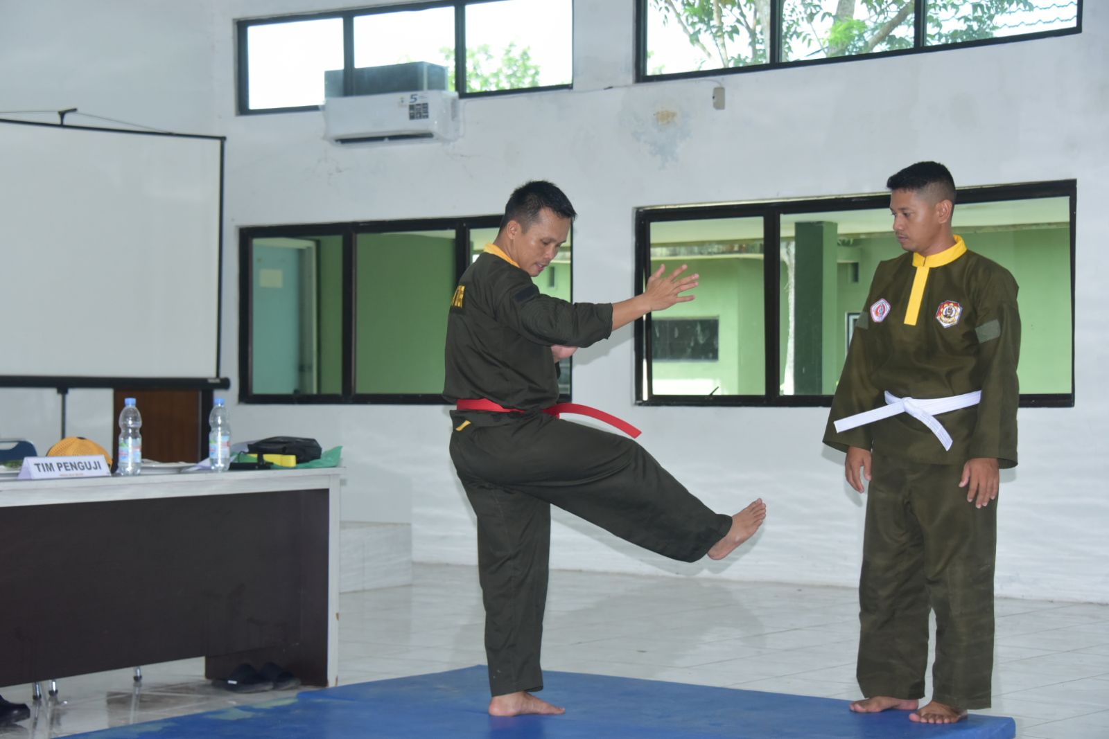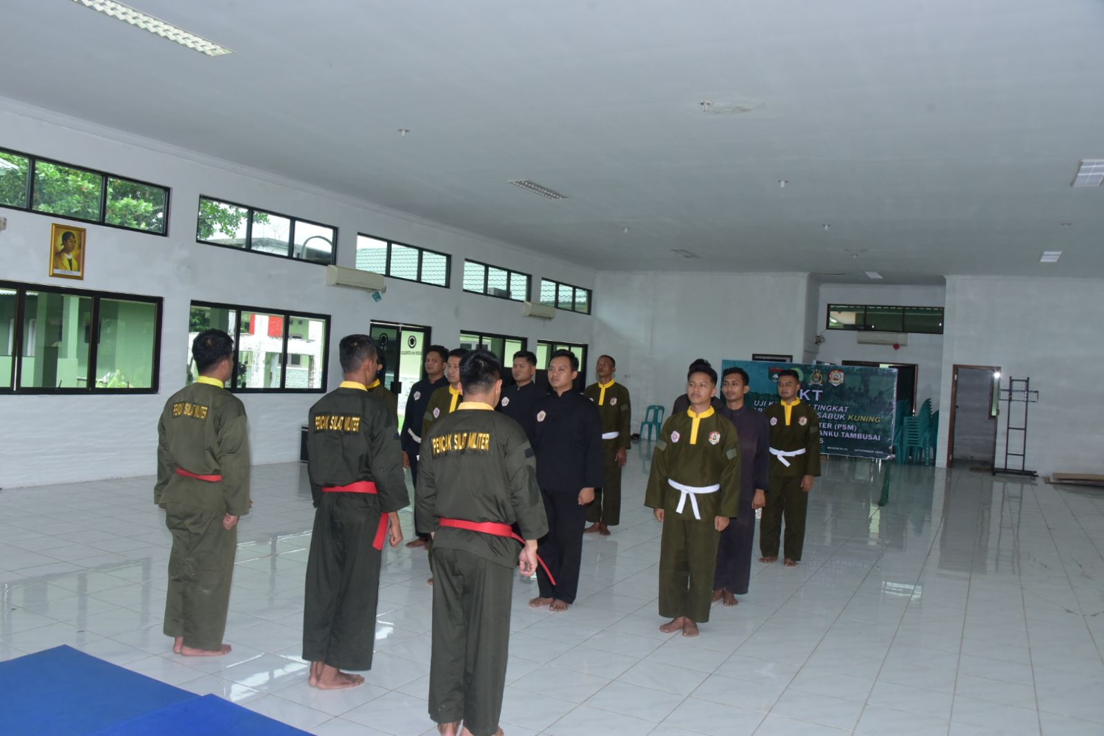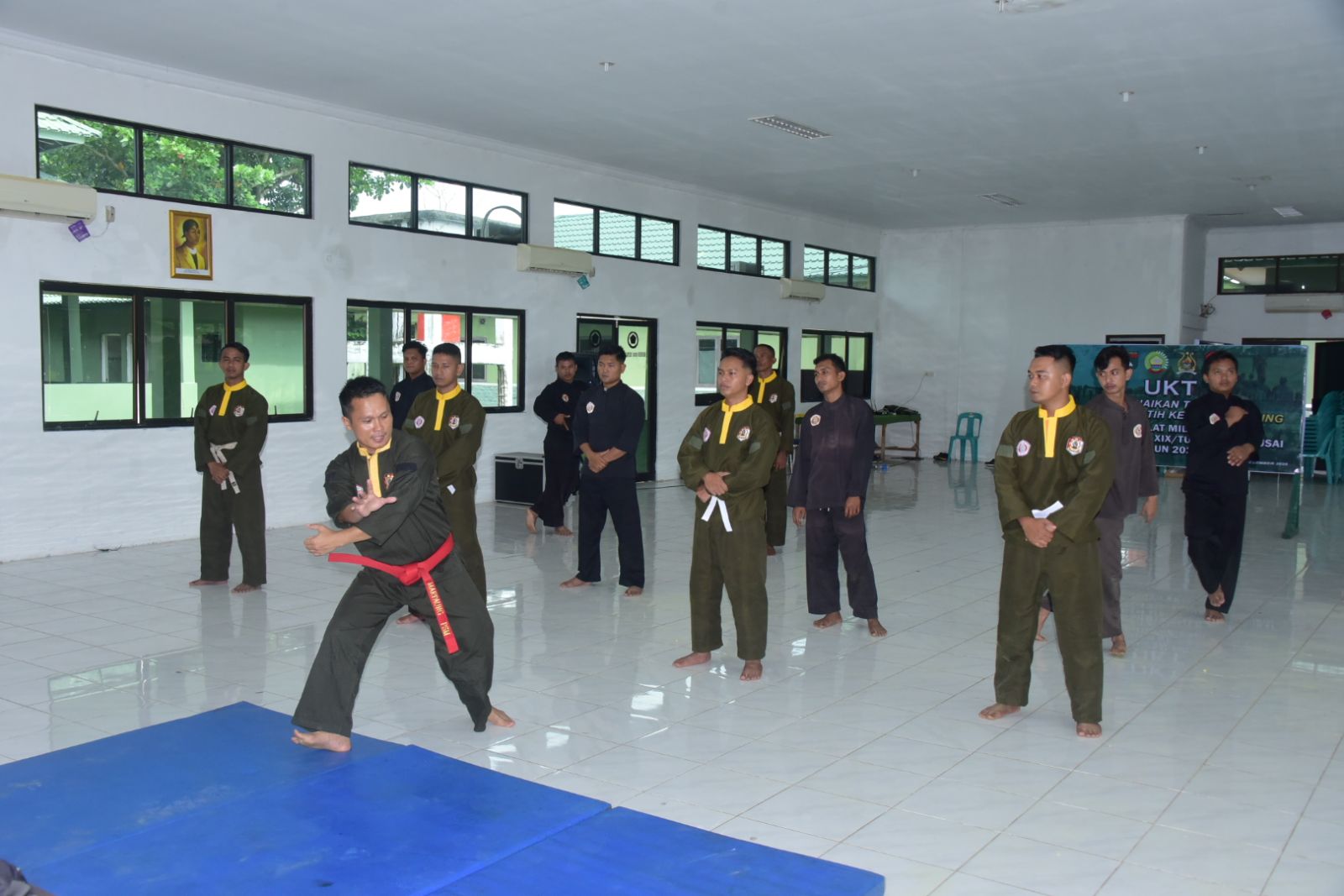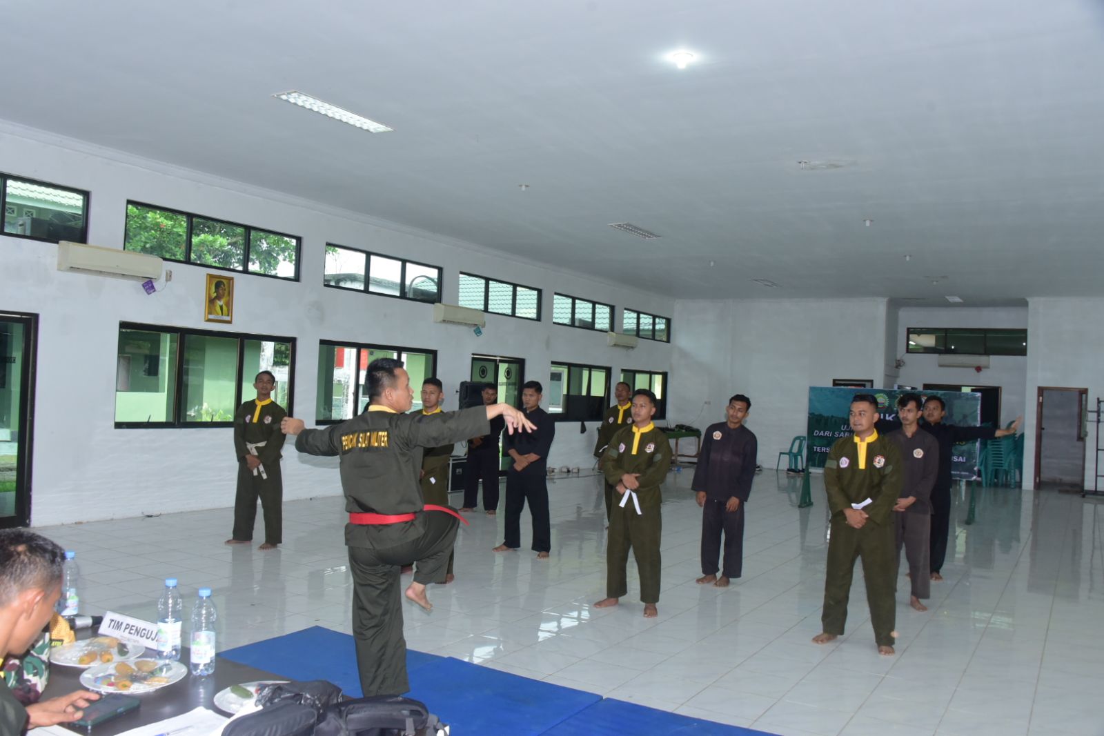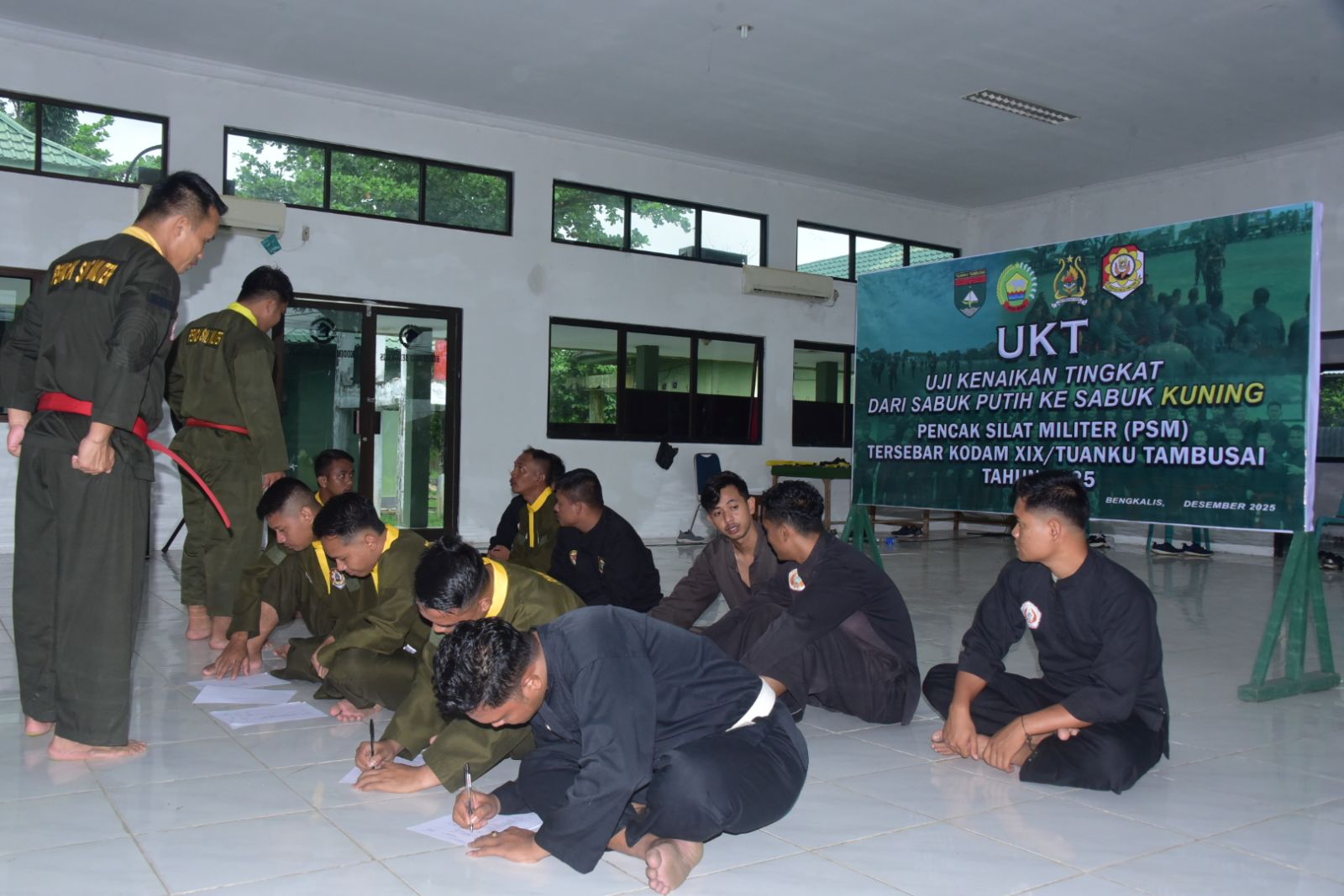 BENGKALIS - Komando Distrik Militer (Kodim) 0303 Bengkalis melakukan Ujian Kenaikan Tingkat (UKT) dari Sabuk Putih ke Sabuk Kuning, Pencak Silat Militer (PSM) tersebar Kodam XIX/Tuanku Tambusai, Kamis 18 Desember 2025, di aula Kodim 0303 Bengkalis.