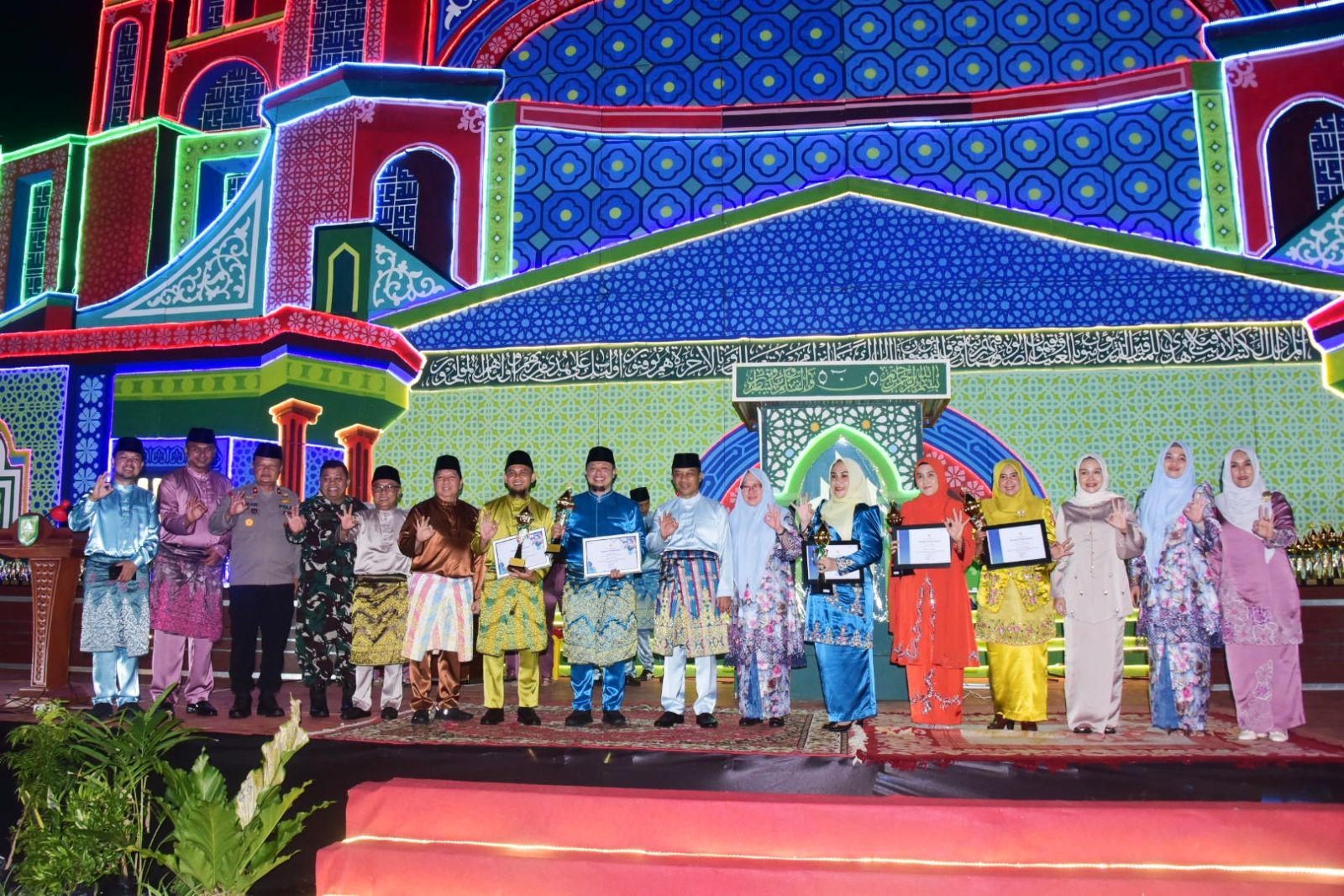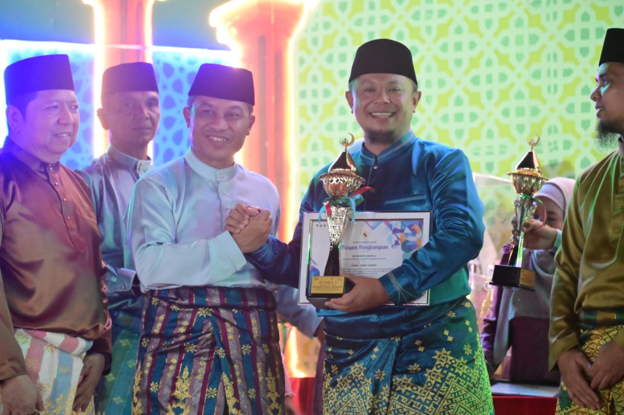Piala dan piagam penghargaan pawai ta'aruf terbaik I, diterima langsung Camat Mandau Riki Rihardi yang diserahkan Wakil Bupati Bengkalis H. Bagus Santoso.