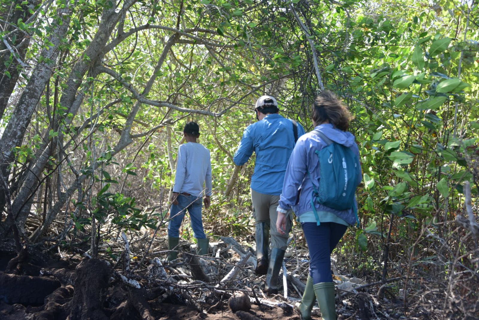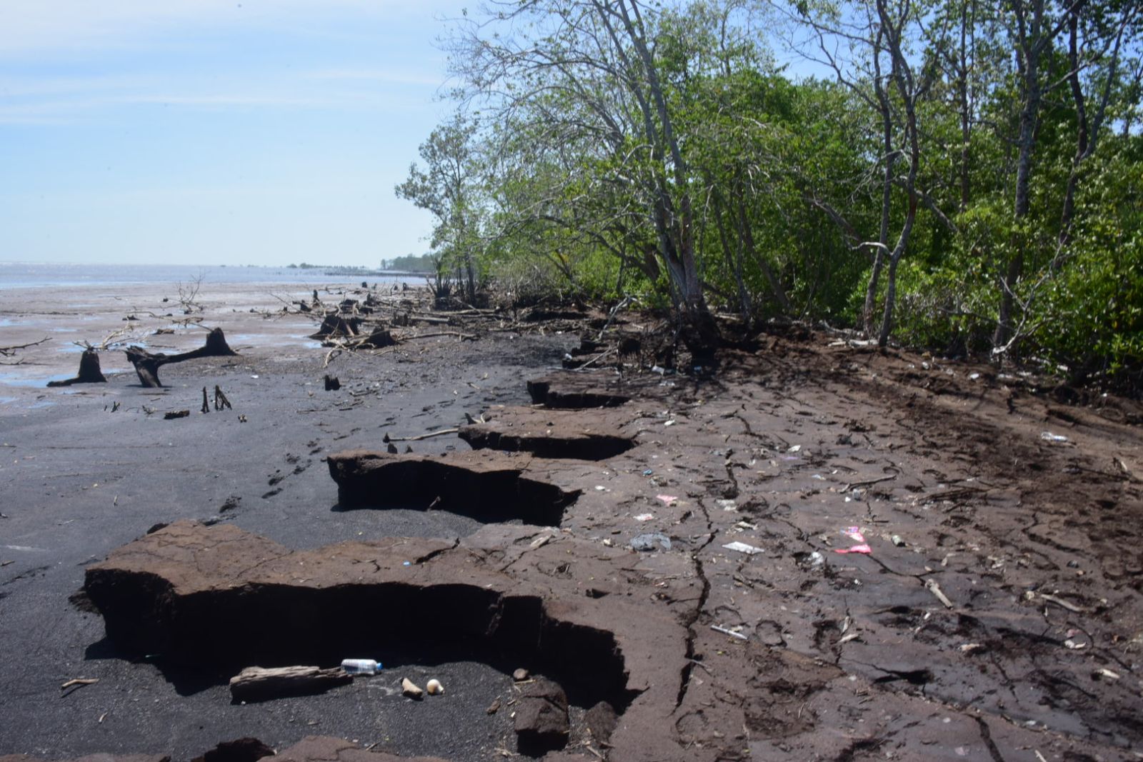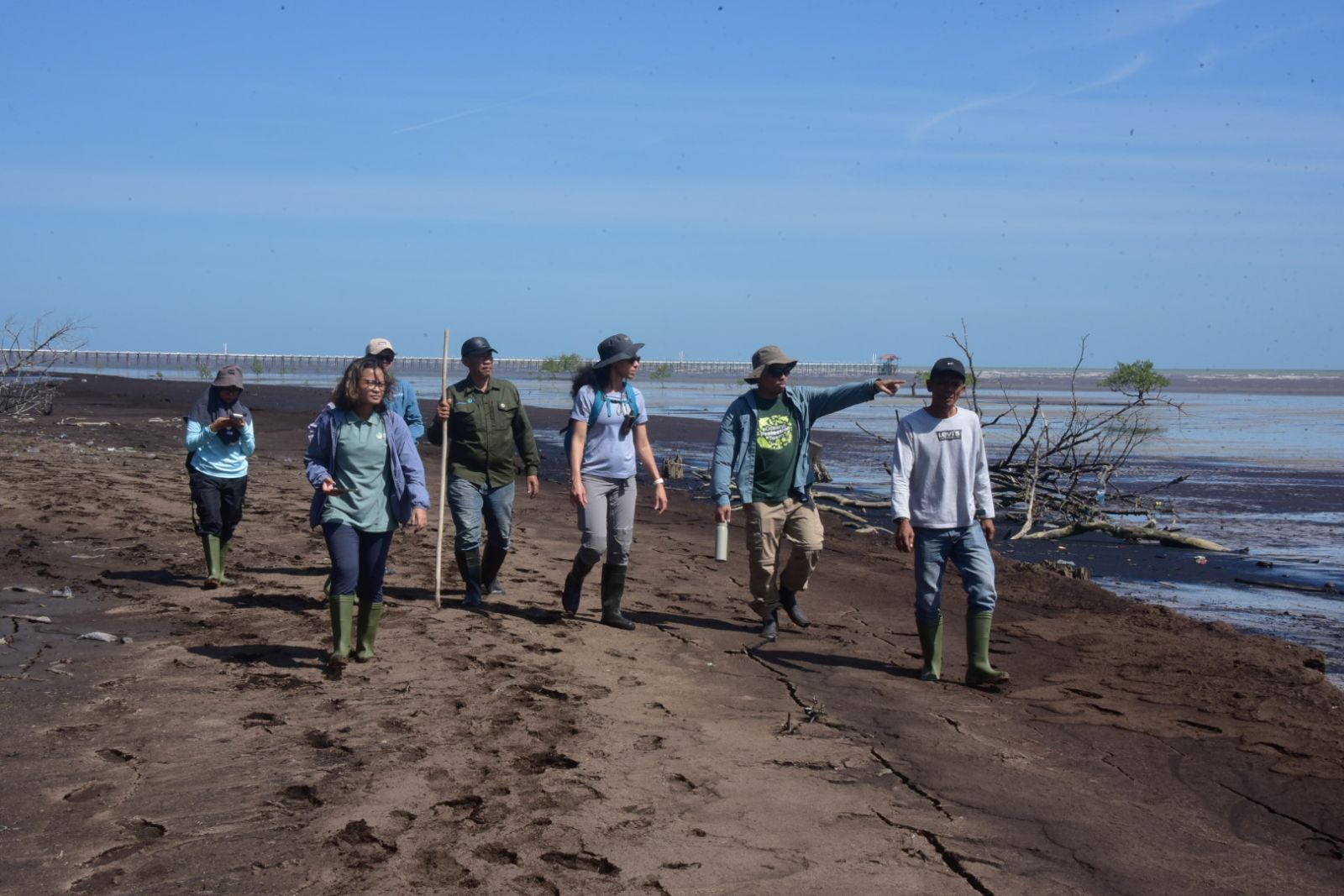 Lokasi pertama, rombongan menuju ke restorasi mangrove di Pantai Senekip, Desa Teluk Pambang. Tim menyisir pantai lebih kurang satu kilometer, berjalan kaki melewati lumpur dan batang-batang pohon hingga ke titik lokasi.