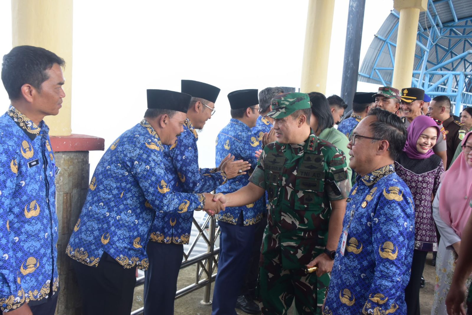 BENGKALIS - Bupati Bengkalis Kasmarni menyambut langsung kedatangan Panglima Komando Daerah Militer (Pangdam) XIX/Tuanku Tambusai, Mayjen TNI Agus Hadi Waluyo bersama istri Ny. Yulia Agus Hadi, ke Negeri Junjungan, Senin 27 April 2026, di Wisma Sri Mahkota.
