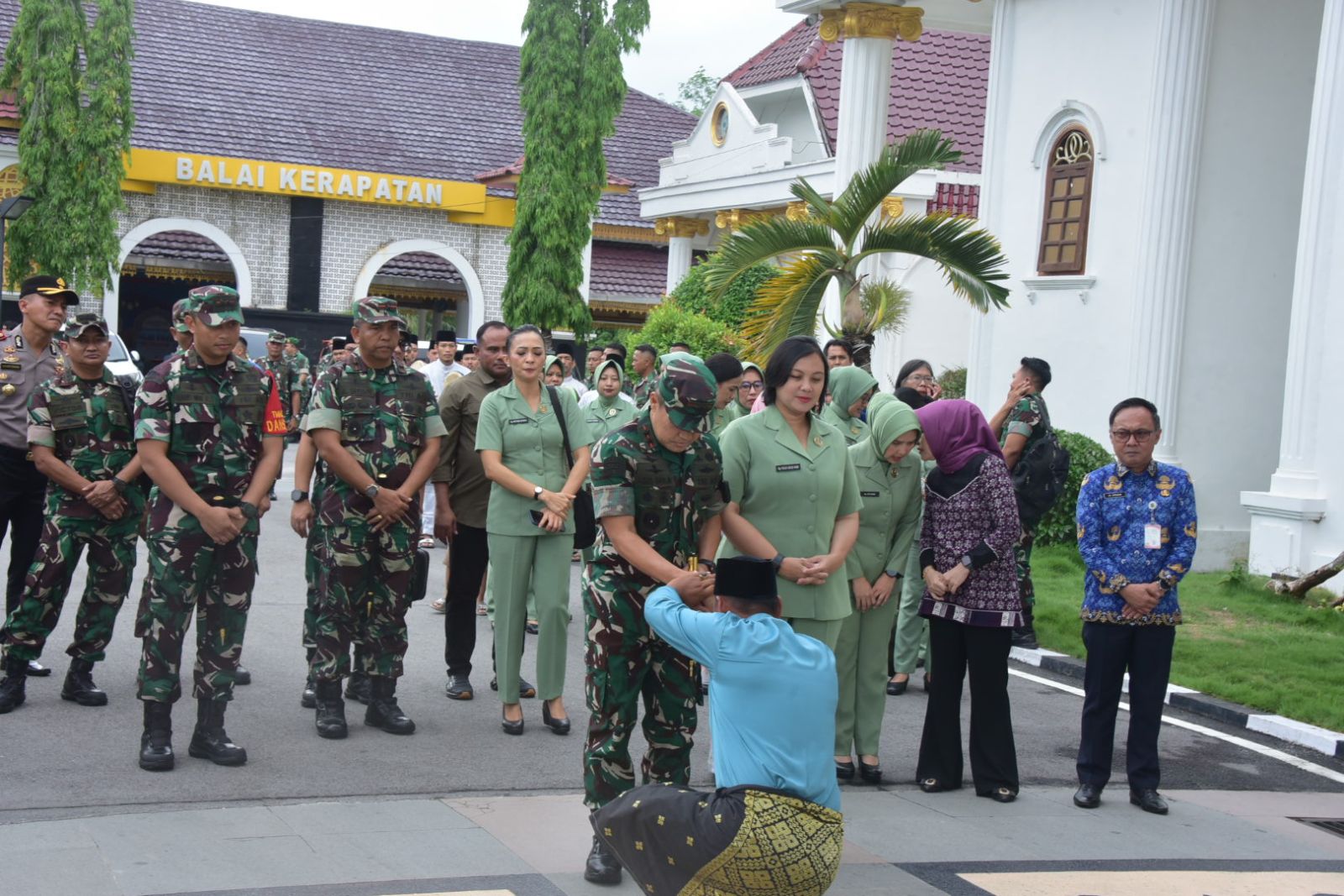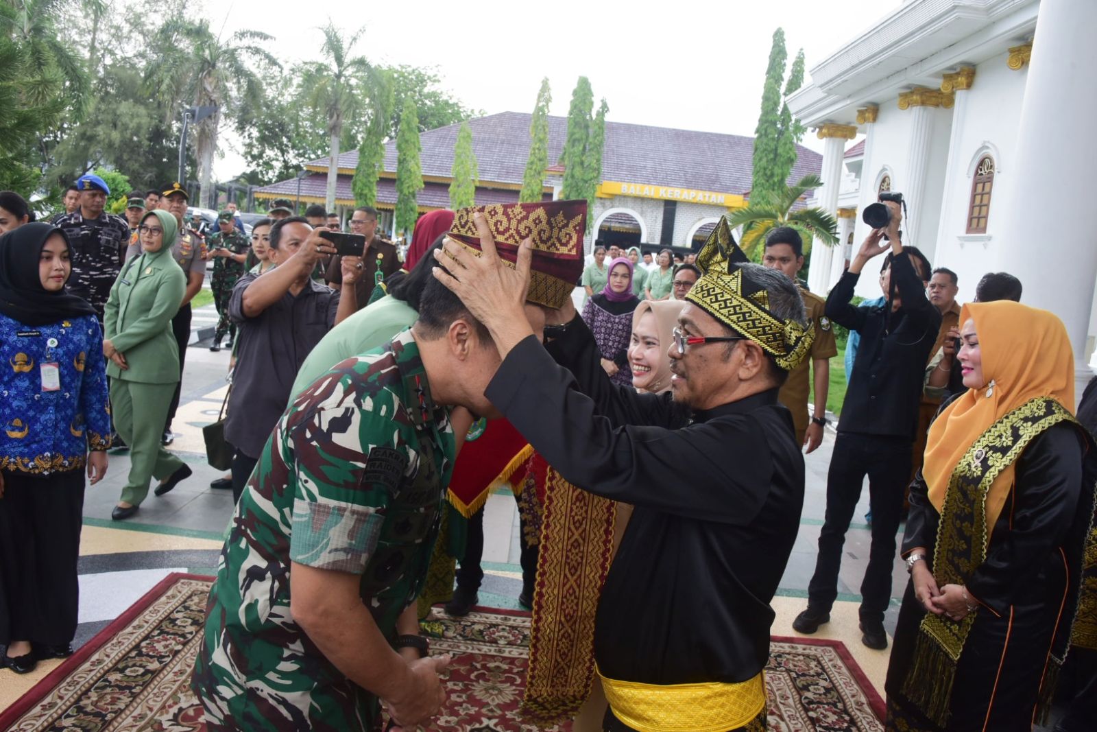 Setibanya di Wisma Sri Mahkota sekitar pukul 15.40 WIB, Pangdam disambut langsung oleh Bupati Kasmarni melalui prosesi adat Melayu yang diawali dengan tabuhan kompang dan atraksi pencak silat, dilanjutkan dengan pemasangan tanjak dan selempang oleh Bupati Kasmarni, serta pemasangan tanjak oleh Ketua Majelis Kerapatan Adat LAMR Kabupaten Bengkalis, Datuk Ilham Nur.
